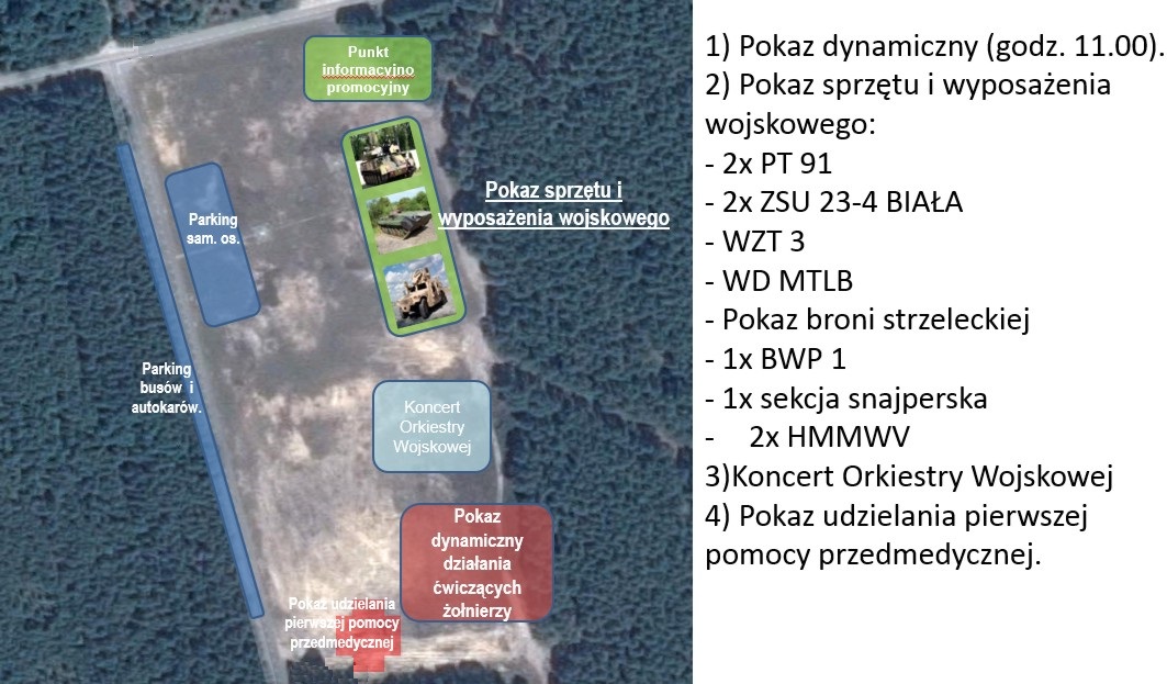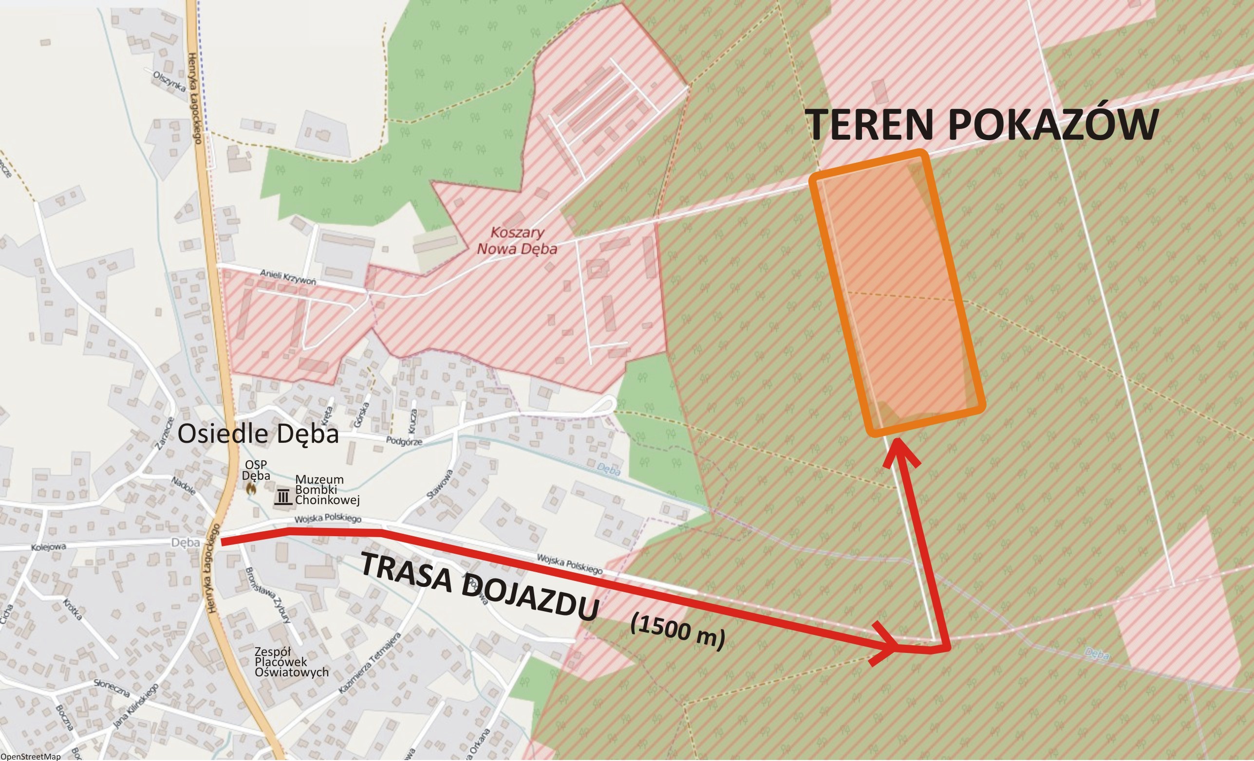 Wjazd na teren pokazów (poligonowe lądowisko) dla autokarów, busów i samochodów osobowych możliwy będzie ulicą Wojska Polskiego w osiedlu Dęba (patrz schemat dojazdu).