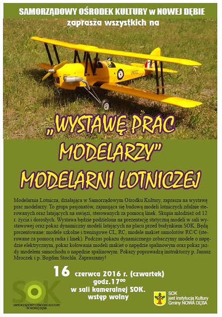 Modelarnia Lotnicza, działająca w Samorządowym Ośrodku Kultury, zaprasza 16 czerwca (czwartek) o godz.17:00 na wystawę prac modelarzy. To grupa pasjonatów, zajmująca się budową modeli lotniczych zdalnie sterowanych oraz latających na uwięzi, sterowanych za pomocą linek. Skupia młodzież od 12 r. życia i dorosłych. Wystawa będzie podzielona na prezentację statyczną modeli w sali wystawowej oraz pokaz dynamiczny modeli latających na placu przed budynkiem SOK. Będą prezentowane: modele szkolne i treningowe CL, RC, modele makiet samolotów RC/C (sterowane za pomocą radia i linek). Podczas pokazu dynamicznego zobaczymy modele o napędzie elektrycznym, pokaz kołowania modeli makiet o napędzie spalinowym oraz pokaz jazdy modelem samochodu o napędzie spalinowym. Pokazy poprowadzą instruktorzy p. Janusz Mroczek i p. Bogdan Stochla. Zapraszamy!