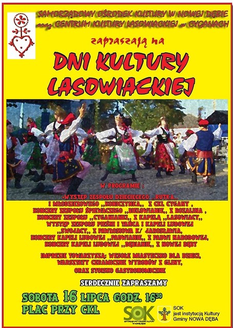 To kolejne święto kultury ludowej we wsi Cygany, uznawanej za kolebkę kultury lasowiackiej - wydarzenie promujące tę kulturę w naszym regionie. Działa tu kilka zespołów ludowych, skupiających w swoich szeregach trzy pokolenia, wielu uzdolnionych artystów amatorów zajmuje się rękodziełem artystycznym. Również w Cyganach zarejestrowanych jest kilka potraw regionalnych, które otrzymały prestiżowy certyfikat potrawy tradycyjnej. Wystąpią zespoły i kapele ludowe: Zespół Pieśni i Tańca z kapelą ludową "Swojaki" z Pawłosiowa k/ Jarosławia, kapela ludowa "Padwianie" z Padwi Narodowej, grupy artystyczne działające w CKL (dziecięcy "Rutka", młodzieżowy "Koniczynka"), zespół "Cyganianki" z kapelą "Lasowiacy", Zespół "Bielowianie" z Rozalina oraz kapela ludowa "Dębianie” z Nowej Dęby. Jak co roku, na najmłodszych czekają warsztaty ceramiczne, wesołe miasteczko, dla wszystkich bogate stoisko gastronomiczne. Zapraszamy!