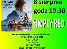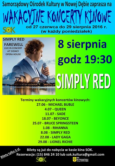 Samorządowy Ośrodek Kultury w Nowej Dębie serdecznie zaprasza na koncert kinowy SIMPLY RED. Projekcja odbędzie się w poniedziałek, 8 sierpnia 2016 r. o godz. 19:30.