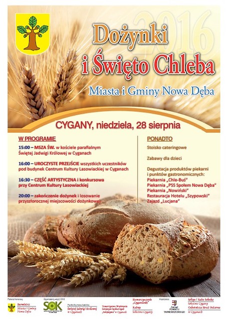 Burmistrz miasta i gminy Nowa Dęba, Samorządowy Ośrodek Kultury oraz sołectwo Cygany zapraszają na Dożynki Gminne zwane Świętem Chleba, które odbędą się w niedzielę 28 sierpnia 2016 r. w Cyganach.
