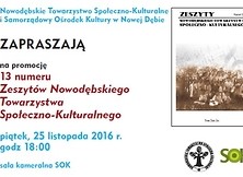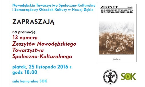 Zapraszamy w piątek 25 listopada 2016 r. o godz. 18:00 do sali kameralnej SOK na promocję 13-tego numeru Zeszytów Nowodębskiego Towarzystwa Społeczno-Kulturalnego. Organizatorami spotkania są Nowodębskie Towarzystwo Społeczno – Kulturalne i Samorządowy Ośrodek Kultury w Nowej Dębie.