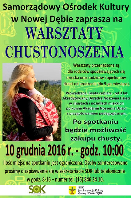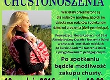 Prowadząca: Beata Łubiarz - od 3 lat Akredytowany Doradca Noszenia Dzieci w chustach i nosidłach miękkich po kursie Akademii Noszenia Dzieci z przygotowaniem pedagogicznym, współpracująca ze szkołami rodzenia na terenie woj. lubelskiego, projektem "Świadoma mama", udzielająca konsultacji indywidualnych i organizująca warsztaty chustonoszenia. Prywatnie mama dwójki chuściochów.