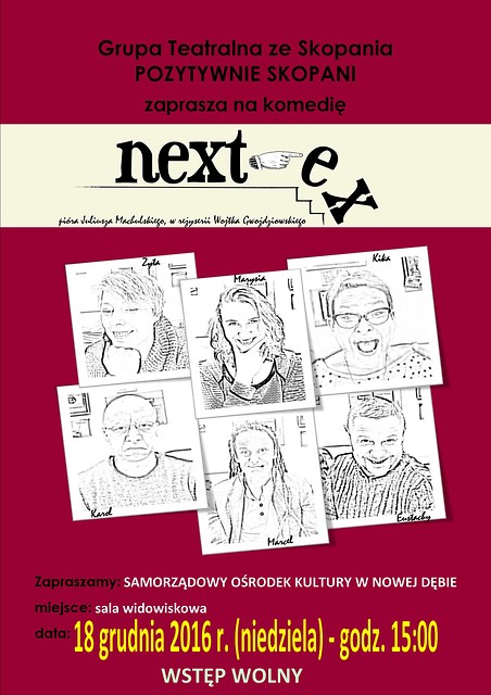 „Next-ex” w wykonaniu Grupy Teatralnej Pozytywnie Skopani w reżyserii Wojtka Gwoździowskiego odbędzie się w niedzielę 18 grudnia w Samorządowym Ośrodku Kultury w Nowej Dębie. Początek o 15.00.