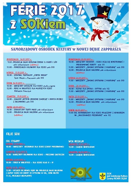 Zapraszamy dzieci od lat 3 (wraz z opiekunami) na bal karnawałowy, połączony z konkursem na najciekawsze przebranie. Impreza odbędzie się w sobotę 28 stycznia 2017 r. od godz. 11:00 w sali tanecznej SOK. Bal poprowadzi profesjonalna animatorka, która zaangażuje dzieci w zabawy, gry i konkursy. Zapraszamy, wstęp wolny!