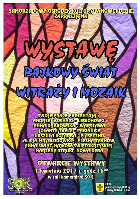 Samorządowy Ośrodek Kultury zaprasza na wernisaż wystawy pt. „Bajkowy świat witraży i mozaik”, który odbędzie się 1 kwietnia 2017 r. (sobota) o godz. 16:00 w sali kameralnej SOK.