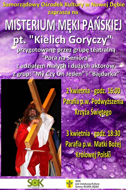 Samorządowy Ośrodek Kultury w Nowej Dębie zaprasza na Misterium Męki Pańskiej pt. "Kielich goryczy", przygotowane przez grupę teatralną "Pora na Seniora" , z udziałem aktorów z grupy "My Czy On Jeden" oraz dzieci z "Bajdurka” - 2 kwietnia 2017 r. (niedziela), o godz. 16.00 - Kościół pw. Podwyższenia Krzyża Świętego, 3 kwietnia 2017 r. (poniedziałek ) o godz. 18.30 – Kościół pw. Matki Bożej Królowej Polski.
