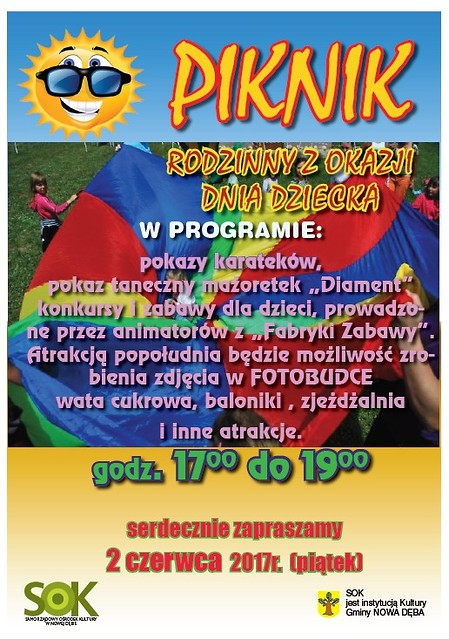 Zapraszamy na pierwszy w nowym sezonie Piknik Rodzinny na placu przed budynkiem SOK 2 czerwca 2017 r. (piątek) w godz. 17.00 do 19:00. Imprezę rozpoczną pokazy karateków, ćwiczących w naszej placówce, następnie będziemy podziwiać pokaz taneczny mażoretek "Diament". W czasie pikniku odbędą się animacje, konkursy i zabawy dla dzieci, prowadzone przez animatorów z "Fabryki Zabawy”. Atrakcją popołudnia będzie możliwość zrobienia zdjęcia w FOTOBUDCE .Na maluchy czekać będzie wata cukrowa, baloniki , zjeżdżalnia i inne atrakcje. Zapraszamy dzieci wraz z opiekunami!
