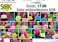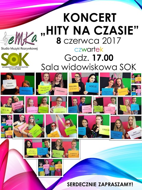 Studio Muzyki Rozrywkowej eMKa zaprasza na koncert podsumowujący sezon 2016/2017 pt. „Hity na czasie", który odbędzie się 8 czerwca 2017 r. (czwartek) o godz. 17:00 w sali widowiskowej SOK.