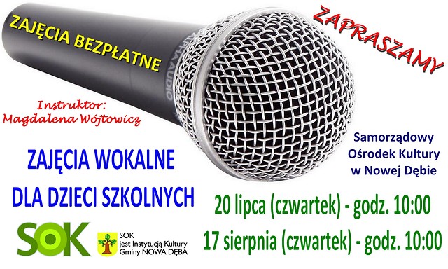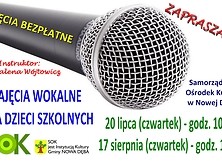 Samorządowy Ośrodek Kultury zaprasza dzieci w wieku szkolnym na warsztaty wokalne, które odbędą się 17 sierpnia (czwartek) 2017r.o godz. 10:00 w sali nr 123, zajęcia poprowadzi instruktor Magdalena Wójtowicz, obejmą ćwiczenia oddechowe, emisyjne oraz pobudzenie wyobraźni muzycznej. Osoby, dla których będzie to pierwszy kontakt ze swoim głosem traktowanym jako instrument, będą miały okazję sprawdzić swoje predyspozycje wokalne podczas pracy indywidualnej, jak również śpiewając w grupie.