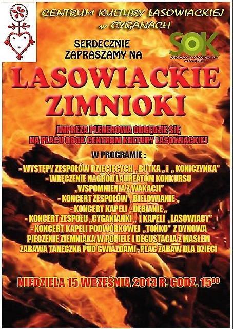 Centrum Kultury Lasowiackiej w Cyganach zaprasza na uroczyste zakończenie wykopków ziemniaka. Impreza odbędzie w dniu 15 września 2013 r. (niedziela) o godz. 15:00 na terenie placu CKL. Podczas imprezy zostaną przeprowadzone konkursy dla dzieci i dorosłych. Nie zabraknie również występów zespołów ludowych z którymi będzie śpiewać pieśni ludowe i biesiadne, konkursu wiedzy o uprawie i potrawach z ziemniaka. Będzie również możliwość degustacji pieczonego ziemniaka w popiele z masłem i słoniną. Gwaramtujemy wspólne śpiewanie i granie przy ognisku. Impreza rok rocznie cieszy się dużą popularnością.