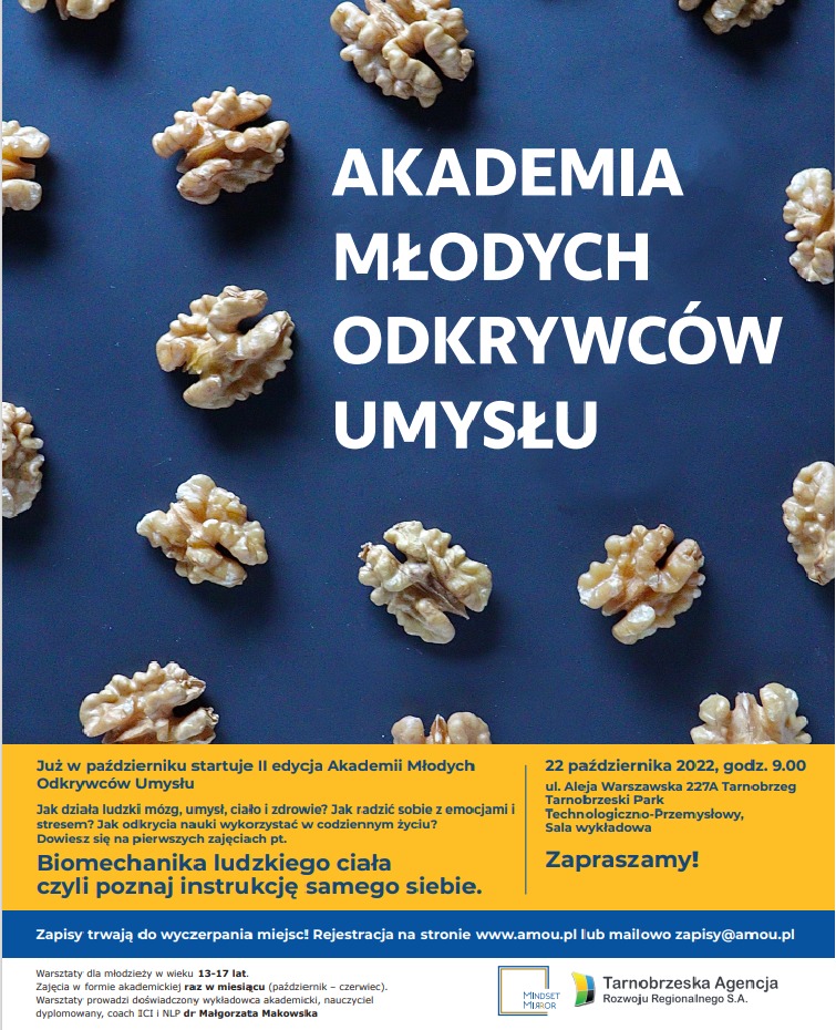 Od października rusza Akademia Młodych Odkrywców Umysłu dla młodzieży w wieku 11 - 16 lat. Zajęcia inne niż w szkole, inne niż gdziekolwiek, oparte na najnowszych osiągnięciach nauki. Twoje dziecko pozna magię emocji, nauczy się panować nad lękiem. apatią, poczuciem winy, złością oraz jak pielęgnować radość, odwagę, motywację. Pozna tajniki ludzkiego mózgu, umysłu i organizmu, a także dowie się jak pozbyć się nudy i jak poradzić sobie emocjonalnie w nowej rzeczywistości. Dowie się rzeczy, których Ciebie nie nauczono w szkole, ale to nie problem, planujemy zajęcia dla Rodziców. To autorski program dr Małgorzaty Makowskiej, oparty na latach doświadczeń, a organizatorem jest Tarnobrzeska Agencja Rozwoju Regionalnego S.A. Dodatkowy walor - część zajęć w języku angielskim!!!