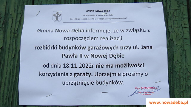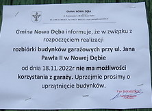 Gmina Nowa Dęba informuje, że w związku z rozpoczęciem realizacji rozbiórki budynków garażowych przy ul. Jana Pawła II w Nowej Dębie od dnia 18.11.2022 r. nie ma możliwości korzystania z garaży. Uprzejmie prosimy o uprzątnięcie budynków.