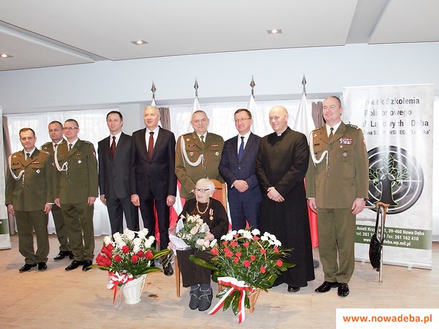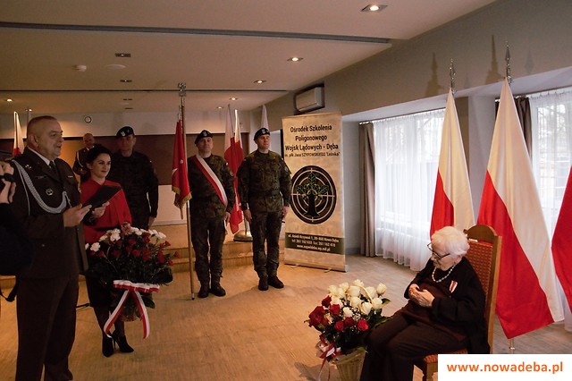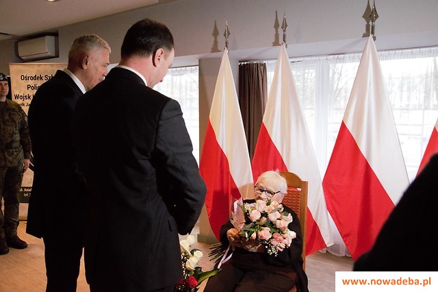 Pani Maria Chodzińska otrzymała także ryngraf ze znakami rodzajów sił zbrojnych, będący wyrazem szczególnego uznania dla barw Wojska Polskiego, który przekazany został przez ministra obrony narodowej - Mariusza Błaszczaka. Kolejnym punktem uroczystości było wręczenie listu gratulacyjnego wraz z życzeniami przez Artura Żubera - komendanta Ośrodka Szkolenia Poligonowego Wojsk Lądowych - Dęba. Życzenia złożone zostały również przez księdza kapitana Michała Kollka - nowo mianowanego proboszcza parafii pw. Dobrego Pasterza. Pani Maria otrzymała także list gratulacyjny napisany przez komendanta Wojskowego Centrum Rekrutacji w Nisku.