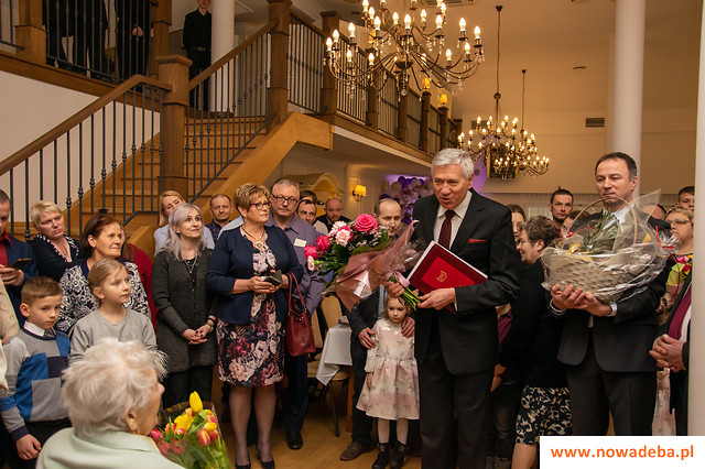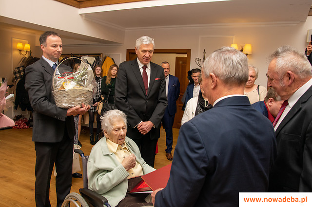Po Mszy Świętej, w „Dworku Belweder” odbyło się uroczyste spotkanie z dostojną Jubliatką. Uczestniczył w nim również ksiądz dziekan Józef Rogowski. Ta piękna i jakże wzruszająca ceremonia była doskonałą okazją do rozmowy z panią Stefanią i przekazania jej okolicznościowych prezentów. Burmistrz wraz z kierownikiem USC wręczyli Jubilatce list gratulacyjny od Premiera RP Mateusza Morawieckiego, list burmistrza, kwiaty oraz kosz upominków. Swoje życzenia złożyli też radny i sołtys. Następnie przyszedł czas na osobiste gratulacje i pozdrowienia dla Jubilatki przez pozostałych uczestników uroczystości.