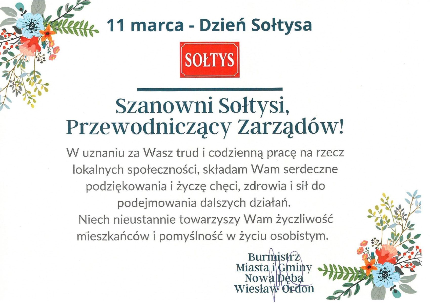 Życzenia i podziękowania Sołtysom, Przewodniczącym Zarządów Osiedli - animatorom lokalnych społeczności - z okazji Dnia Sołtysa.