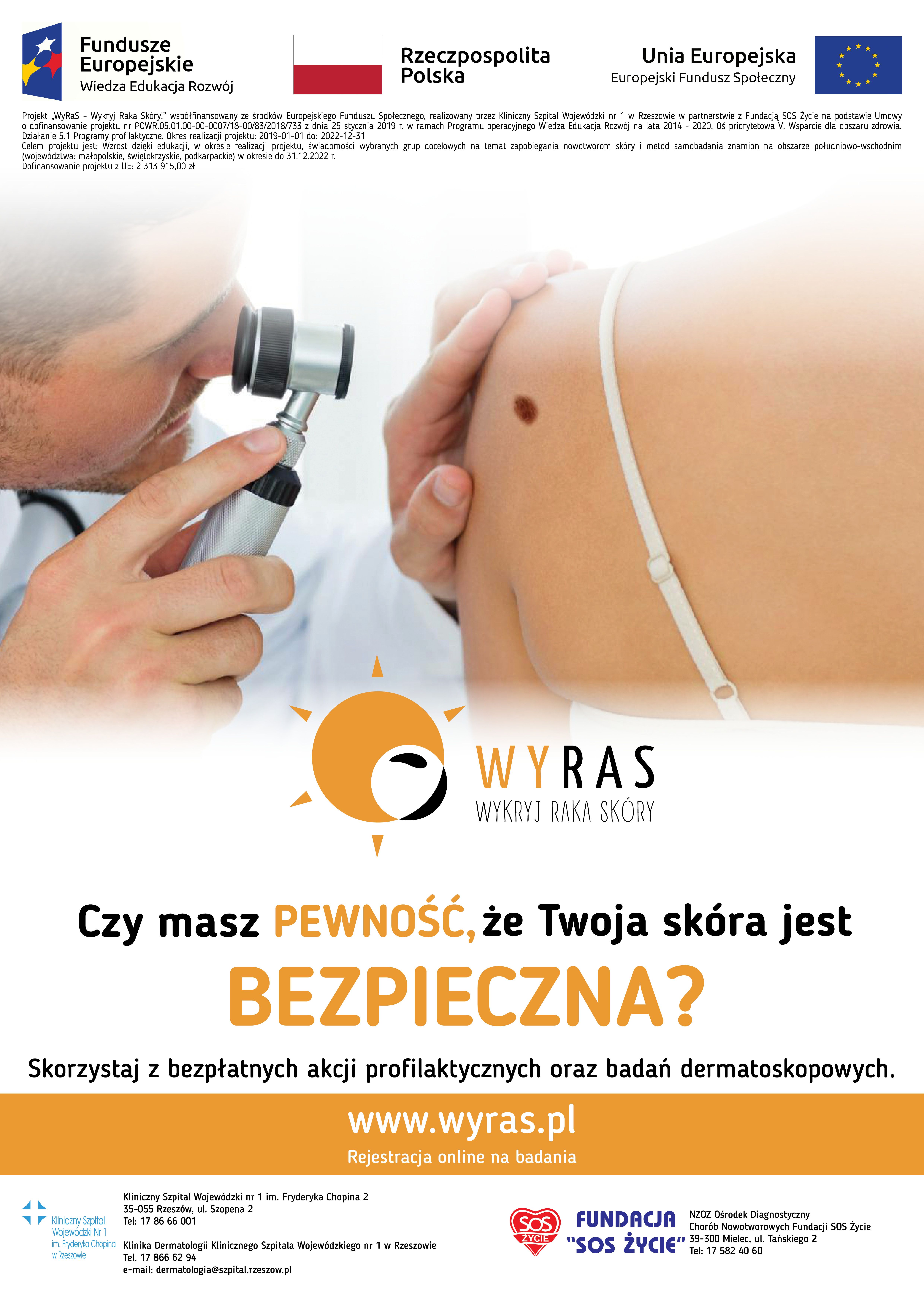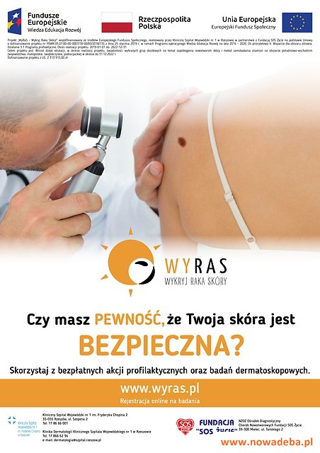 18 marca razem z Klinicznym Szpitalem Wojewódzkim nr 1 im. Fryderyka Chopina w Rzeszowie zapraszamy na bezpłatne badania dermatoskopowe, które dedykowane są wszystkim zainteresowanym bez względu na płeć i wiek. Rejestracja obowiązkowa pod numerem 17 582 40 60 – liczba miejsc ograniczona.