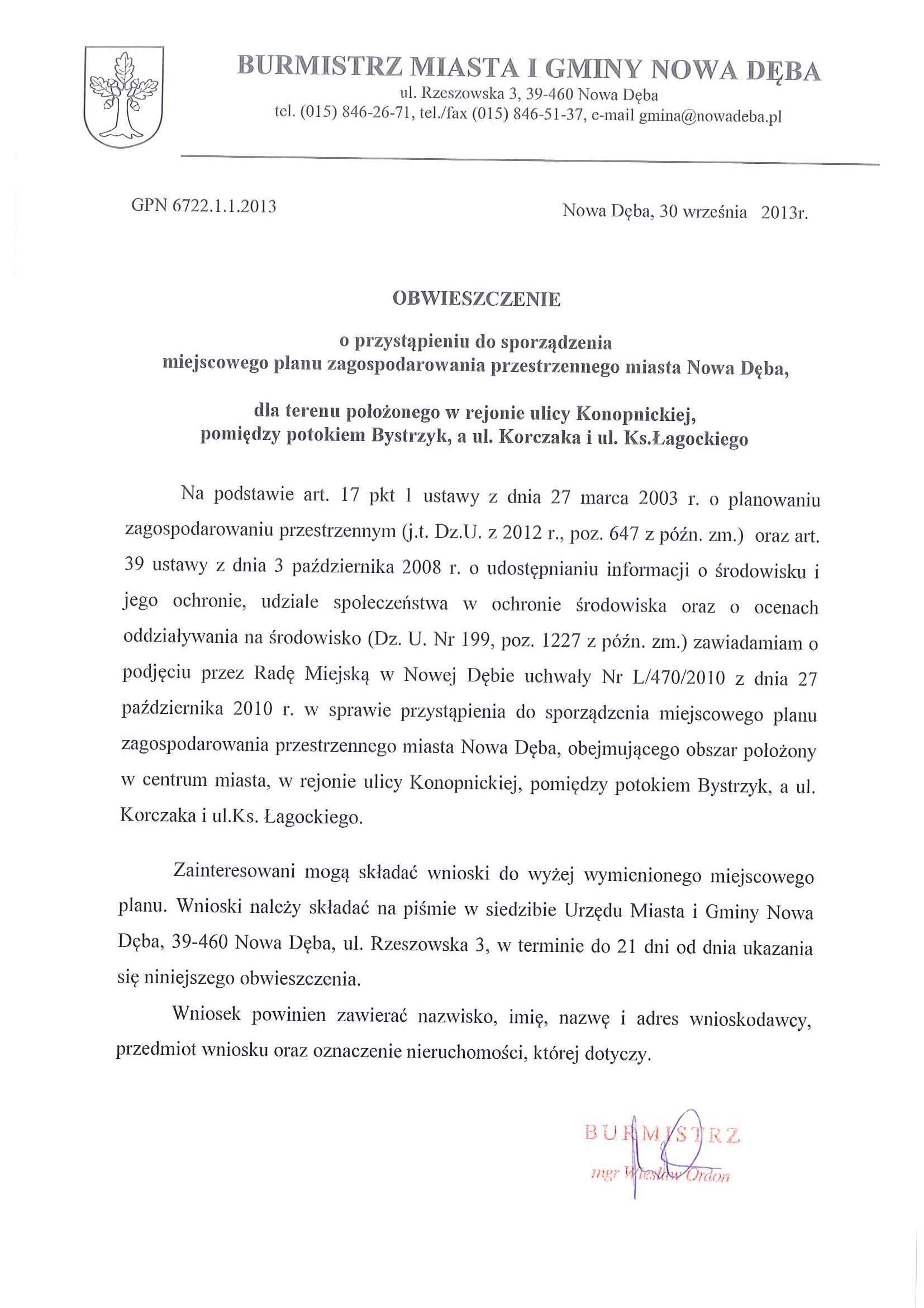 Obwieszczenie o przystąpieniu do sporządzenia miejscowego planu zagospodarowania przestrzennego miasta Nowa Dęba