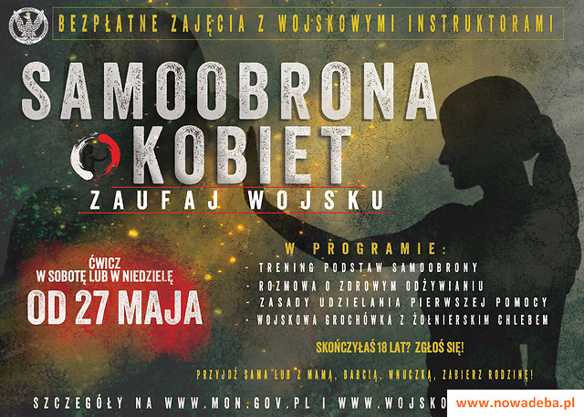 Ministerstwo Obrony Narodowej wraz z Centralnym Wojskowym Centrum Rekrutacji i Dowództwem Generalnym Rodzajów Sił Zbrojnych organizuje bezpłatne szkolenia z samoobrony dla dorosłych Polek. Szkolenia z doświadczonymi żołnierzami – instruktorami odbywać się będą w wybrane soboty i niedziele wiosną i latem w parkach miejskich, na plażach, w ośrodkach sportu i rekreacji na terenie całej Polski.