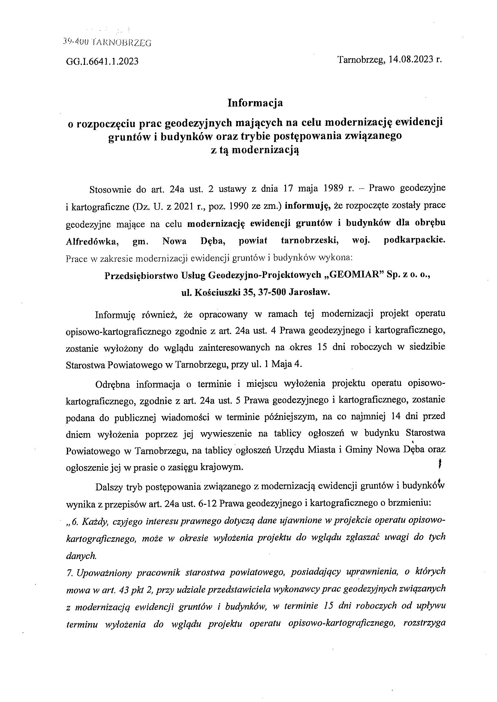 Informacja o rozpoczęciu prac geodezyjnych mających na celu modernizację ewidencji gruntów i budynków w miejscowości Alfredówka