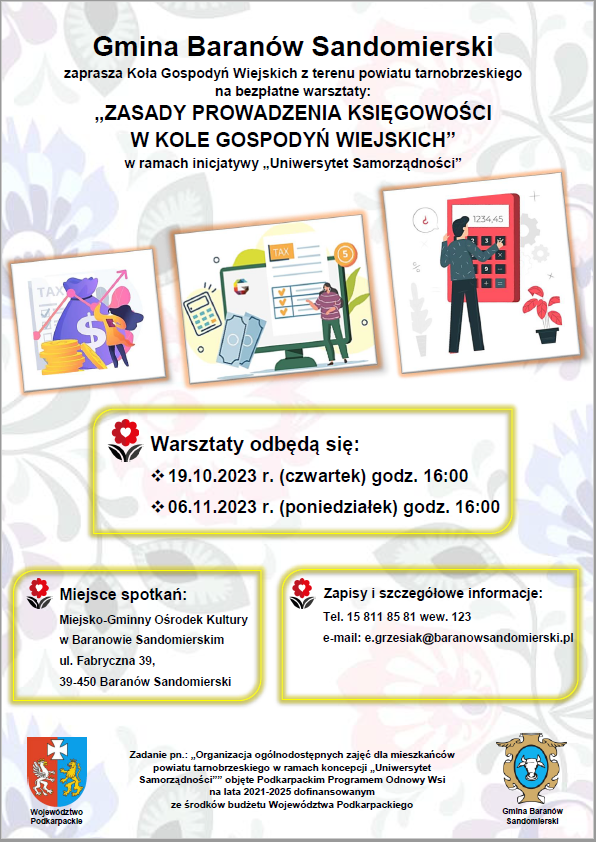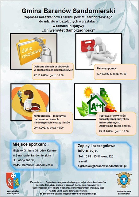 Mając na uwadze potrzeby mieszkańców powiatu tarnobrzeskiego, Gmina Baranów Sandomierski realizuje zadanie pn.: „Organizacja ogólnodostępnych zajęć dla mieszkańców powiatu tarnobrzeskiego w ramach koncepcji „Uniwersytet Samorządności””, które realizowane jest dzięki pozyskanej pomocy finansowej w ramach koncepcji „Uniwersytet Samorządności” objętej „Podkarpackim Programem Odnowy Wsi na lata 2021-2025” dofinansowanym ze środków budżetu Województwa Podkarpackiego. Zajęcia odbywać się będą w formie ogólnodostępnych spotkań.