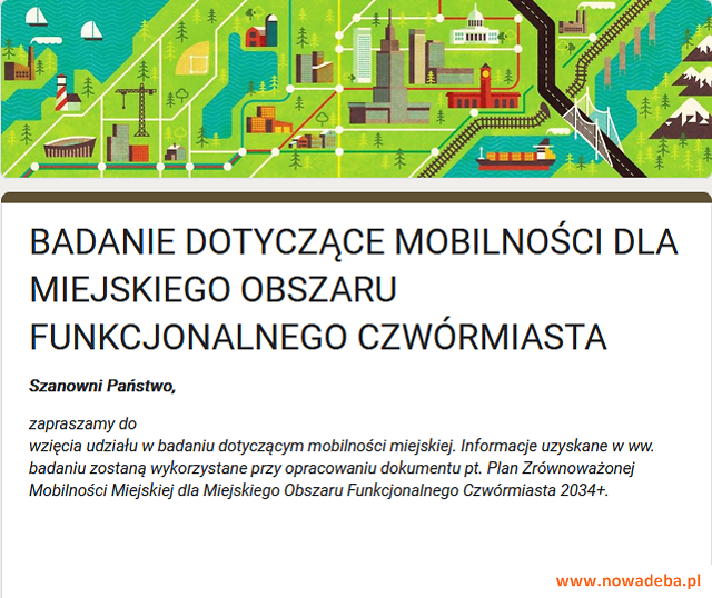 Każdy z nas może aktywnie uczestniczyć w tworzeniu Planu Zrównoważonej Mobilności Miejskiej dla Miejskiego Obszaru Funkcjonalnego Czwórmiasta, dlatego zapraszamy do wzięcia udziału w badaniu dotyczącym mobilności miejskiej.