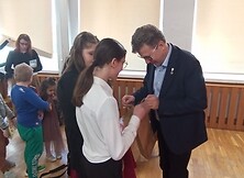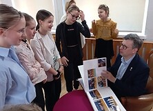 Jako podziękowanie od naszej szkolnej społeczności, pan Marek Michalak otrzymał m.in. prace plastyczne naszych uczniów obrazujące prawa dziecka. Jego biblioteczka wzbogaciła się również o dwie książki, których z pewnością nie miał, jedną autorstwa naszego Patrona: „Z Dzikowa do Ziemi Świętej”, drugą był tomik poezji Zofii Tarnowskiej – Moss, wnuczki Patrona.