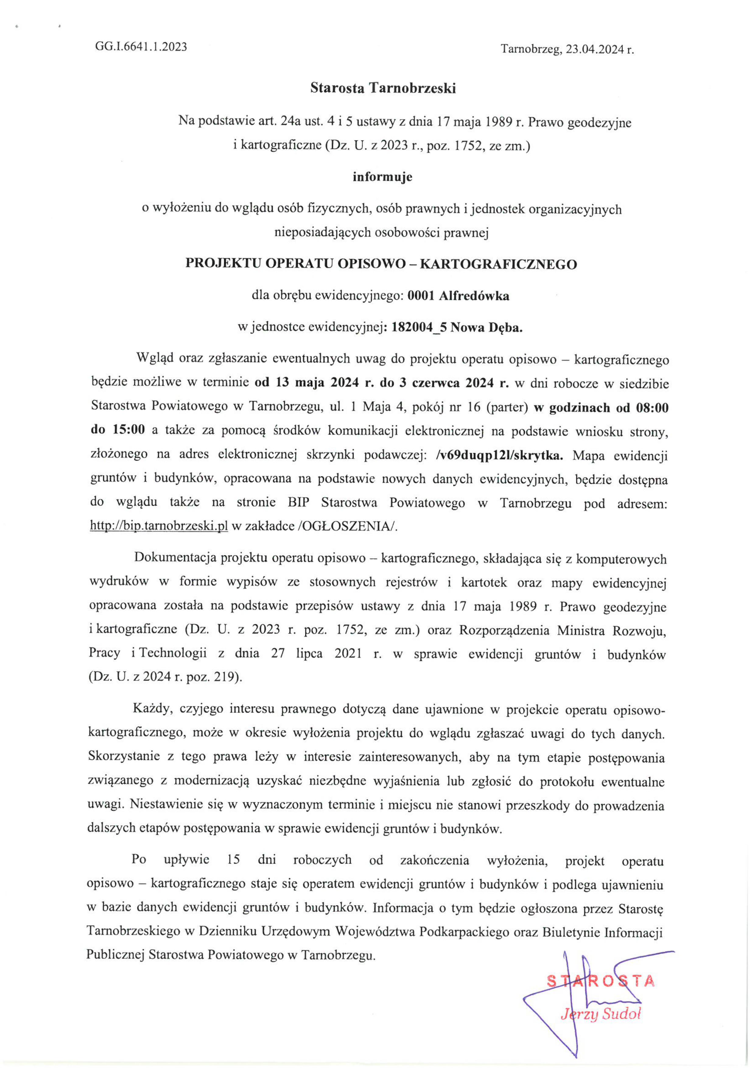 Informacja Starosty Tarnobrzeskiego o wyłożeniu do wglądu projektu operatu opisowo-kartograficznego obrębu Alfredówka