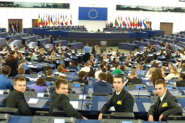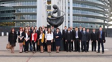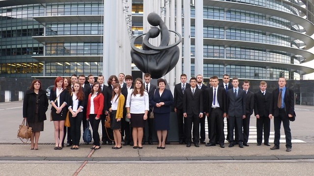 Po kilku godzinach jazdy i zwiedzaniu katedry koronacyjnej królów francuskich w Reims, dojechaliśmy do niemieckiego uzdrowiska Baden-Baden na nocleg. Dzień 25 października rozpoczął się dla nas bardzo wcześnie. Przed Parlamentem byliśmy przed godzina 9.00. Czas na pierwsze zdjęcia i stoimy przed budynkiem, w którym zapadają wiążące decyzje dla 28 państw Unii Europejskiej. Po kontroli bezpieczeństwa przeszliśmy do sali, w której czekali już uczniowie z kilkunastu innych państw europejskich. Tam został dokonany podział na grupy, by od tej pory pracować w zespołach międzynarodowych. To jeden z celów programu, uczniowie ze szkół krajów UE, poznają się, dyskutują, negocjują, wnoszą poprawki i przyjmują rezolucje. Po uzgodnieniu wspólnego stanowiska, wszyscy spotykają się w monumentalnej sali obrad parlamentu, gdzie odbywa się wspólna debata oraz głosowanie przy użyciu specjalnych kart. Uczestnicy zadają pytania i wysłuchują odpowiedzi. Wszystkim udziela się wyjątkowy nastrój tego szczególnego miejsca. W tym jedynym dniu nasza szkoła reprezentowała Polskę i zarazem wszystkie szkoły w Polsce! Administratorzy Euroscoli pozwolili każdej szkole na krótką prezentację oraz przemarsz pocztów sztandarowych przy dźwiękach hymnu UE. Tak zakończyła się przygoda z Parlamentem Europejskim.