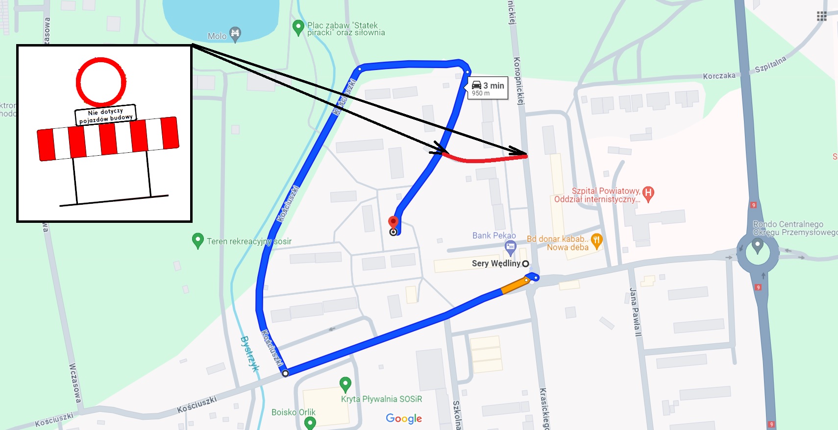W związku z rozpoczynającą się przebudową dróg wewnątrzosiedlowych na Osiedlu Północ w Nowej Dębie, od 10 czerwca br. dojazd do ul. Kwiatkowskiego możliwy będzie wyłącznie przez ul. Kościuszki.