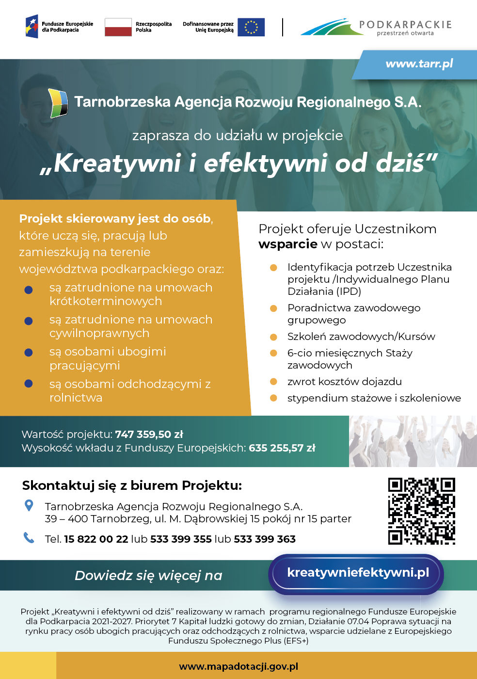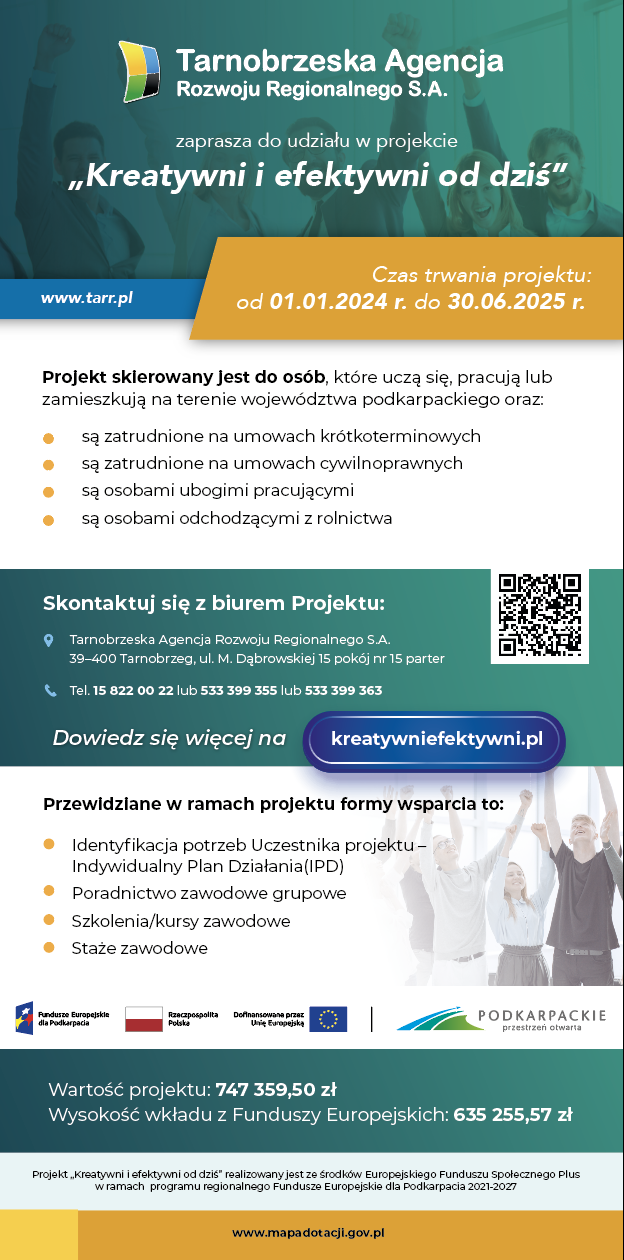 Szczegółowe informacje o projekcie dostępne są na stronie www.kreatywniefektywni.pl w Biurze Projektu: ul. M. Dąbrowskiej 15, 39-400 Tarnobrzeg w godz. 7.30-15.30 oraz pod nr telefonów: 15 822-00-22, 533-399-363, 533-399-355.