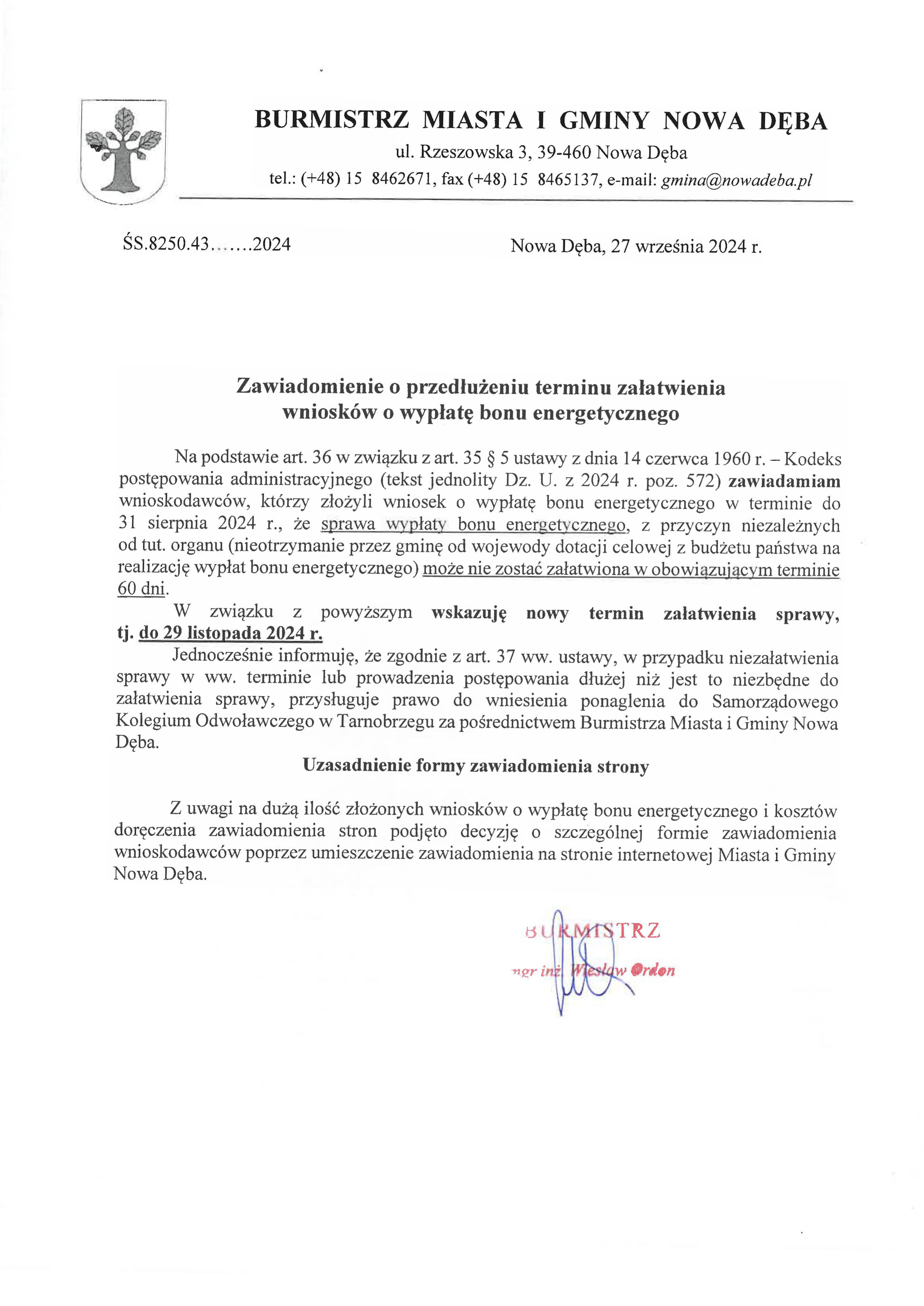 Zawiadomienie o przedłużeniu terminu załatwienia wniosków o wypłatę bonu energetycznego