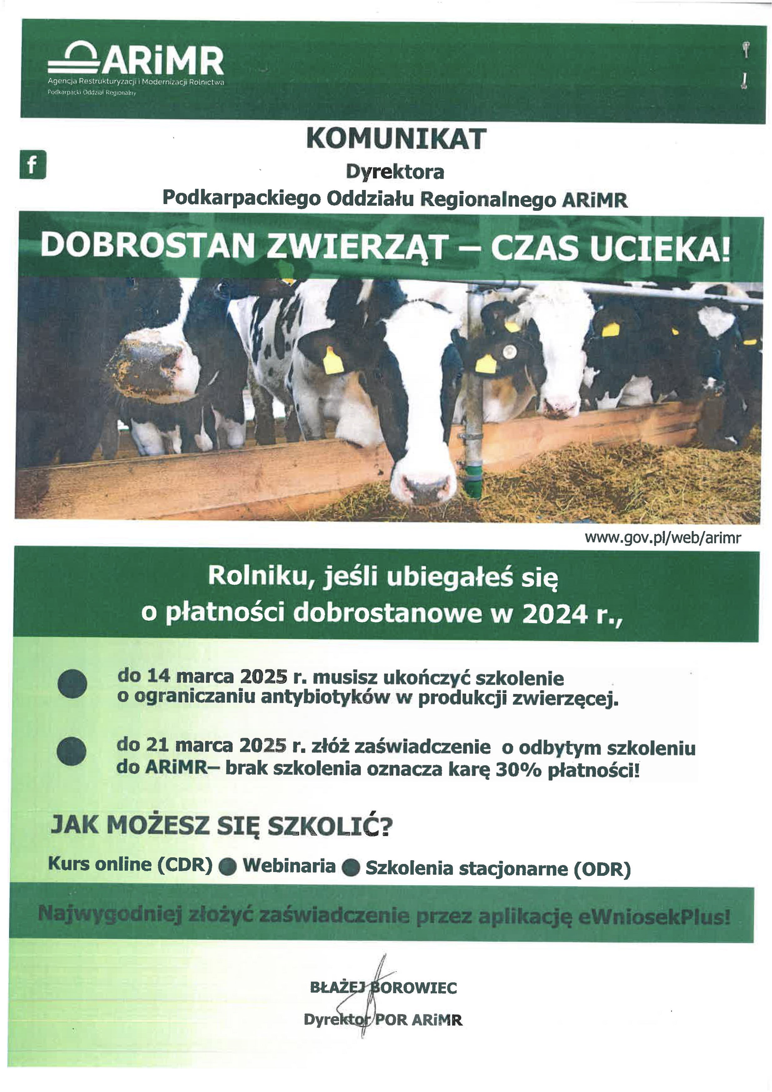 Dyrektor Podkarpackiego Oddziału Regionalnego Agencji Restrukturyzacji i Modernizacji Rolnictwa informuje o prowadzonej kampanii informacyjnej dotyczącej rolników, którzy chcą otrzymać płatności dobrostanowe za 2024 r. Każdy, kto zdecydował się na skorzystanie z ekoschematu Dobrostan zwierząt, ma obowiązek odbyć szkolenie z zakresu metod ograniczających stosowanie antybiotyków w produkcji zwierzęcej w terminie do 14 marca roku następującego po roku złożenia wniosku o przyznanie płatności dobrostanowej.