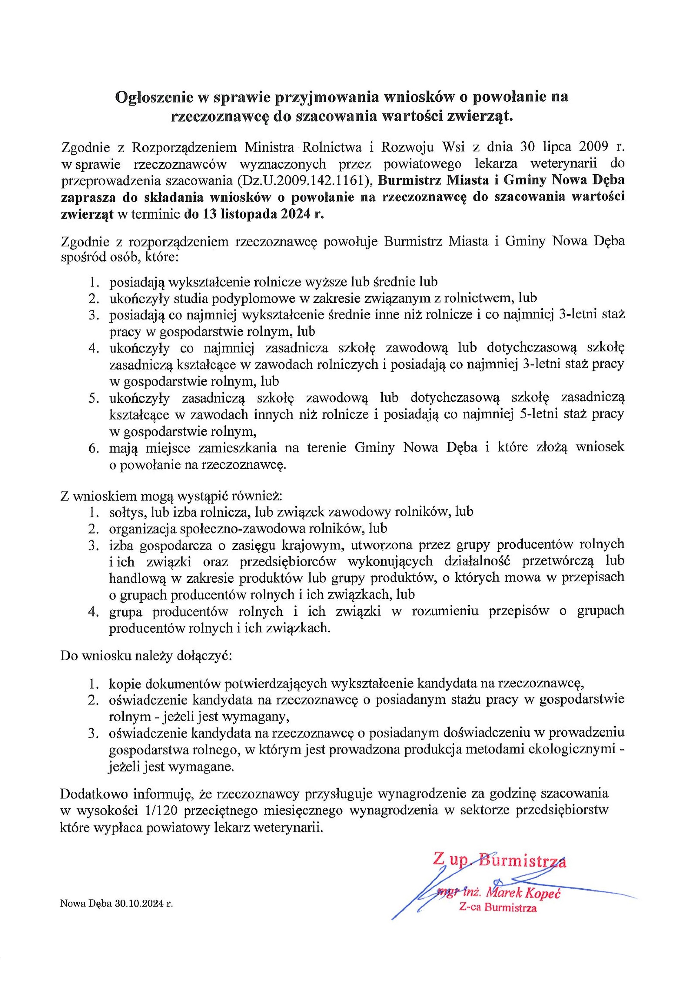 Ogłoszenie w sprawie przyjmowania wniosków o powołanie na rzeczoznawcę do szacowania wartości zwierząt