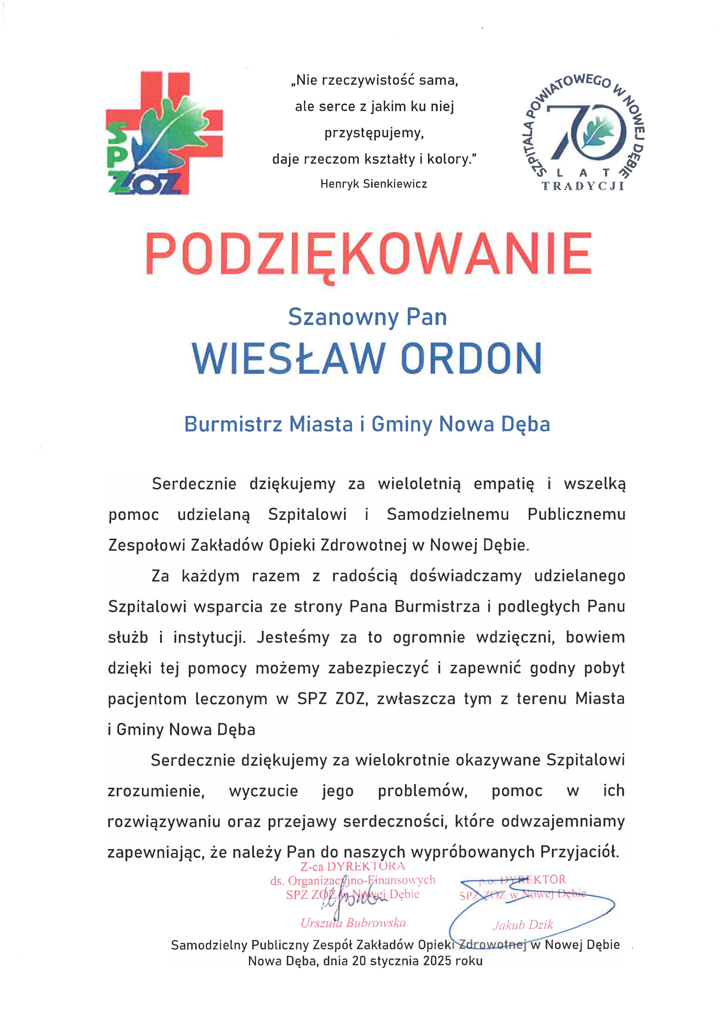 Poniżej przedstawiamy pełną treść podziękowania, które dyrekcja szpitala skierowała do Burmistrza Miasta i Gminy Nowa Dęba Wiesława Ordona.