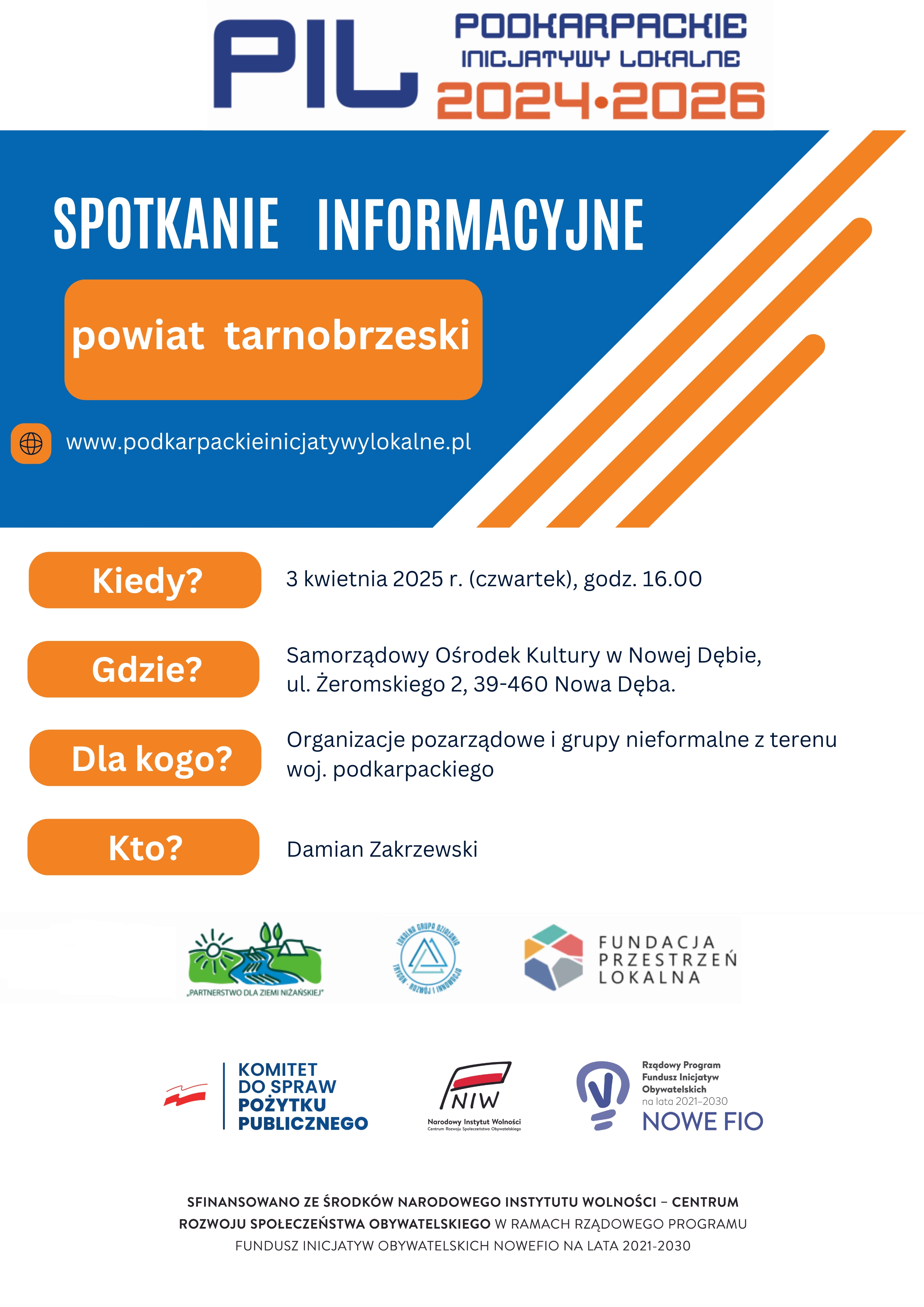 - 20 marca 2025 r. (czwartek), godz. 16.00 (powiat niżański). Miejsce spotkania: Niżański Uniwersytet Ludowy w Wolinie; ul. Piaskowa 10, 37-400 Wolina, sala szkoleniowa - parter.