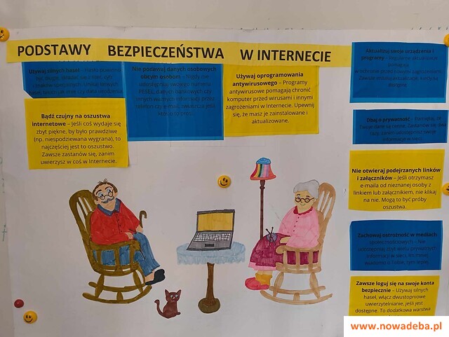 Poruszono także zagadnienia związane z podstawami bezpieczeństwa w sieci, takie jak używanie silnych haseł oraz korzystanie z odpowiedniego oprogramowania antywirusowego. Seniorów uwrażliwiono na zagrożenia związane z atakami cyberprzestępców, podkreślając, jak ważne jest zachowanie ostrożności w przypadku podejrzanych połączeń telefonicznych, wiadomości oraz linków.