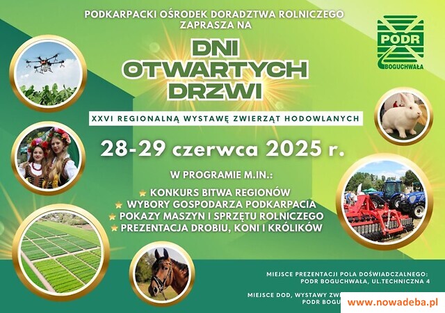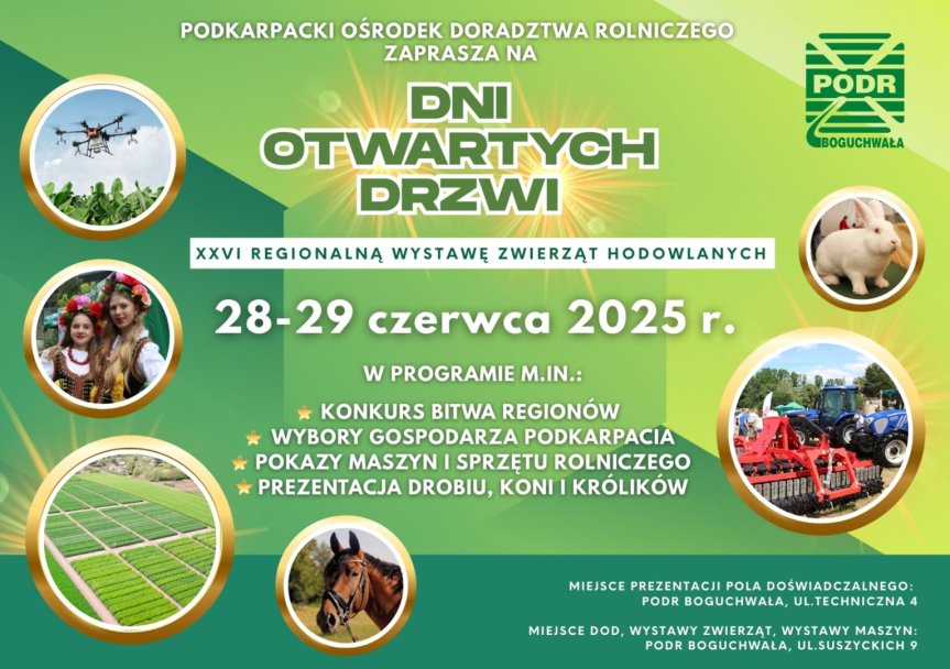 Dyrektor PODR zaprasza 28-29 czerwca na Dni Otwartych Drzwi oraz XXVI Regionalną Wystawę Zwierząt Hodowlanych w Boguchwale. W programie: konkurs „Gospodarz Roku Województwa Podkarpackiego”, wystawy zwierząt i maszyn, kiermasze, degustacje potraw, warsztaty, konkursy i występy kapel. Gwiazdą imprezy będzie zespół Krywań.