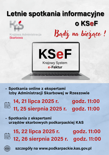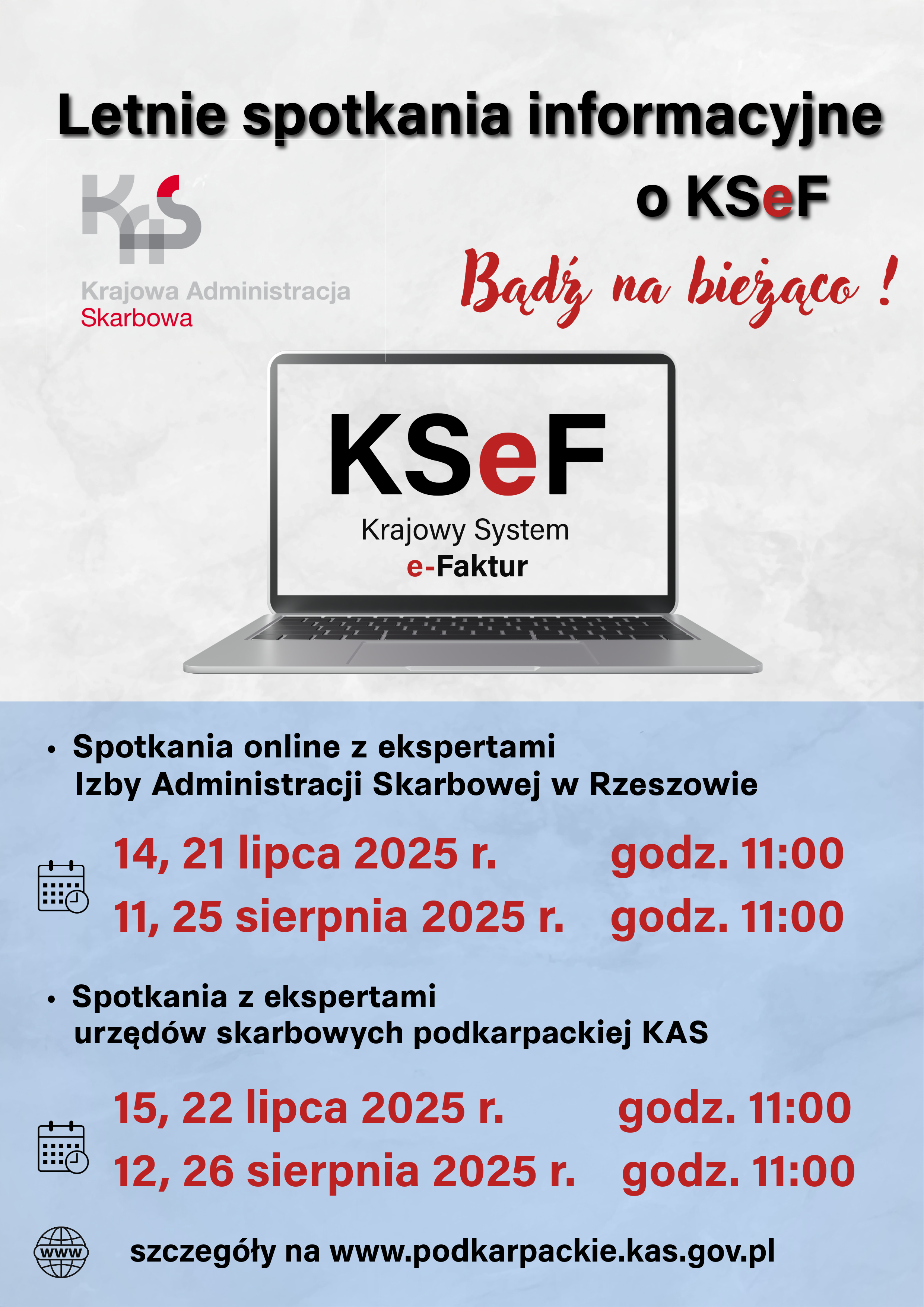 Dyrektor Izby Administracji Skarbowej w Rzeszowie zaprasza przedsiębiorców, księgowych, doradców podatkowych oraz wszystkich zainteresowanych na serię bezpłatnych spotkań informacyjnych w ramach cyklu Letnie spotkania informacyjne o KSeF. Bądź na bieżąco.