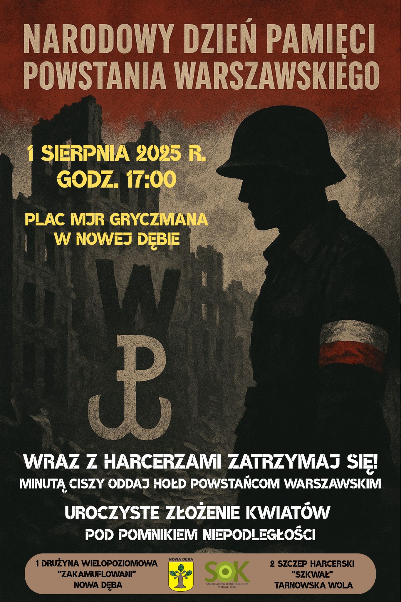 W tym roku Narodowy Dzień Pamięci Powstania Warszawskiego będzie można uczcić wraz z harcerzami z 1. Drużyny Wielopoziomowej „Zakamuflowani” Nowa Dęba oraz 2. Szczepu Harcerskiego „Szkwał” Tarnowska Wola. O godzinie 17.00 na Placu mjr. Jana Gryczmana odbędzie się uroczyste złożenie kwiatów pod Pomnikiem Niepodległości. Zachęcamy wszystkich mieszkańców do zatrzymania się w tym momencie i oddania hołdu minutą ciszy powstańcom.
