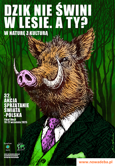 W dniach 19-21 września 2025 roku odbędzie się finał ogólnopolskiej 32. Akcji Sprzątanie świata - Polska, organizowanej przez Fundację Nasza Ziemia. Tegorocznej edycji przyświeca hasło "W Naturę z Kulturą" , a jej plakat przygotował artysta Andrzej Pągowski, który w satyryczny sposób przypomina, że w lesie i nad wodą obowiązują dobre maniery.