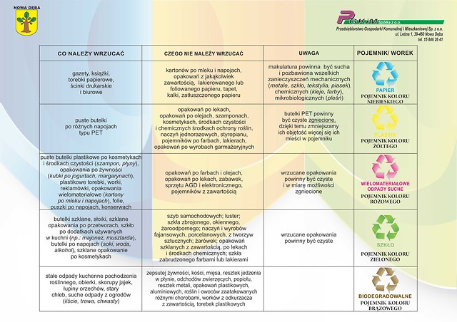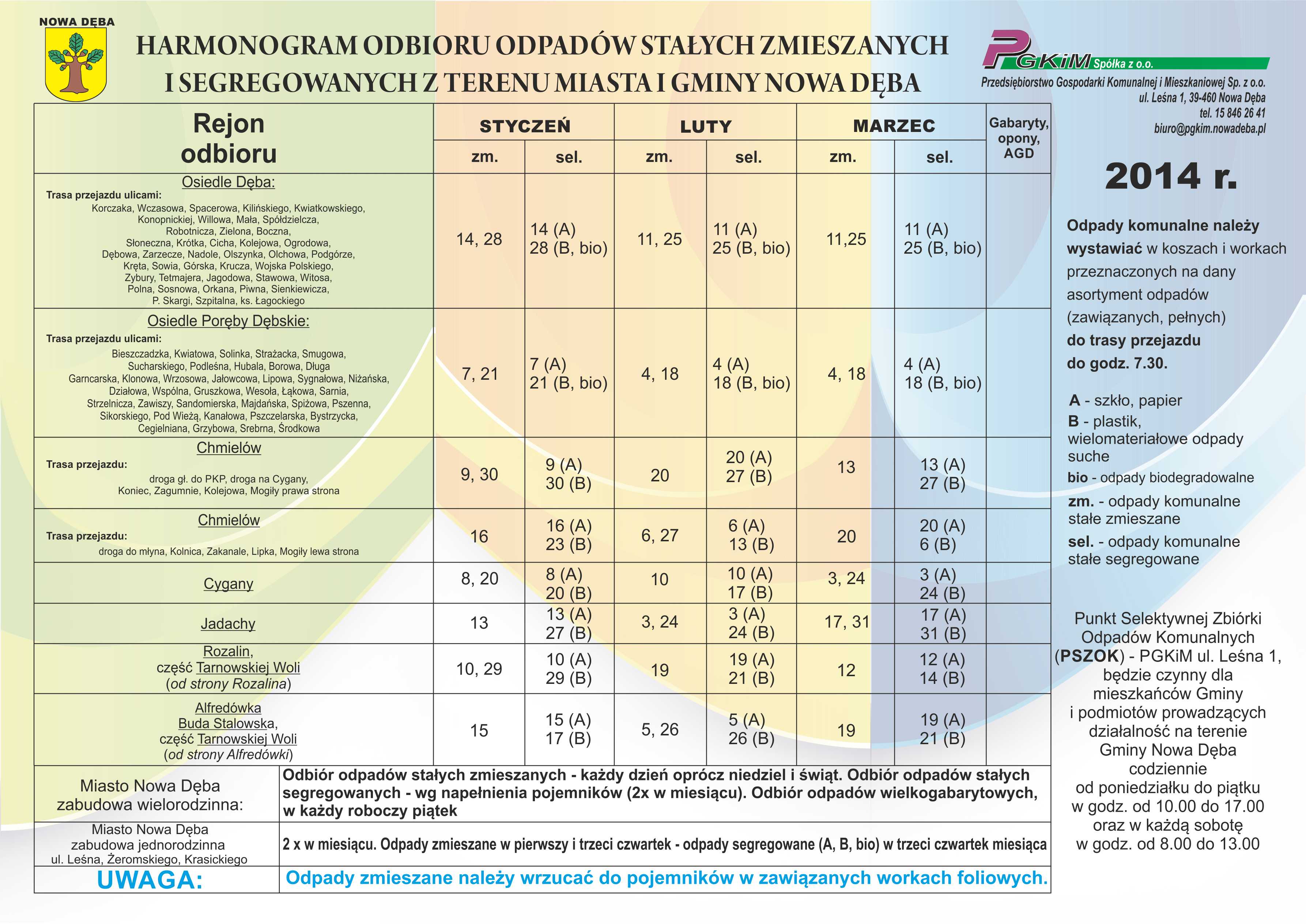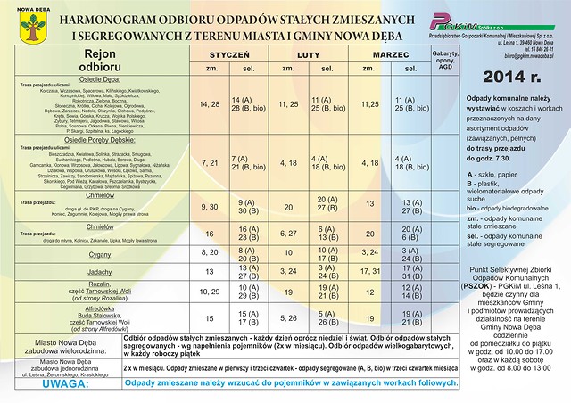W załączeniu przedstawiamy "Harmonogram odbioru odpadów stałych zmieszanych i segregowanych z terenu Miasta i Gminy Nowa Dęba na okres od 1 stycznia 2014 r. do 31 marca 2014 r."