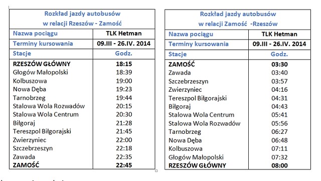 Najważniejsze zmiany nastąpią w województwie podkarpackim. W relacji Warszawa - Przemyśl pozostają dwie pary pociągów dziennych TLK "Solina” oraz TLK "San”., które kursować będą przez Lublin, Pilchów k. Stalowej Woli, Tarnobrzeg, Nową Dębę i Rzeszów. TLK "Hetman” relacji Zamość - Poznań - Zamość będzie kursował w skróconej relacji Rzeszów - Poznań - Rzeszów ze względu na niską frekwencję podróżnych. Zdaniem kolejarzy przeciętnie na odcinku Rzeszów – Nowa Dęba – Tarnobrzeg, Stalowa Wola - Zamość z pociągu korzystało około 20-30 pasażerów. Oznacza to, że z Tarnobrzega, Nowej Dęby i Stalowej Woli na trasie "Hetmana" będzie odjeżdżał autobus jako komunikacja zastępcza na tym odcinku.