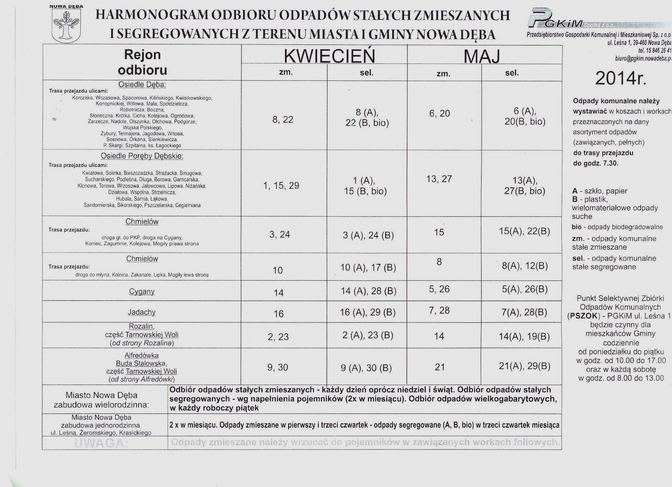 W związku z zawarciem Umowy nr GKS.6232.16.2014 z Przedsiębiorstwem Gospodarki Komunalnej i Mieszkaniowej w Nowej Dębie, na "Odbiór, transport i zagospodarowanie odpadów komunalnych z terenu Gminy Nowa Dęba w okresie 01.04.2014 - 30.06.2014 r., zawartej w trybie art. 67 ust. 1, pkt 3 ustawy Prawo zamówień publicznych, w załączeniu przedstawiamy "Harmonogram odbioru odpadów stałych zmieszanych i segregowanych z terenu Miasta i Gminy Nowa Dęba na okres od 1 kwietnia 2014 r. do 31 maja 2014 r."
