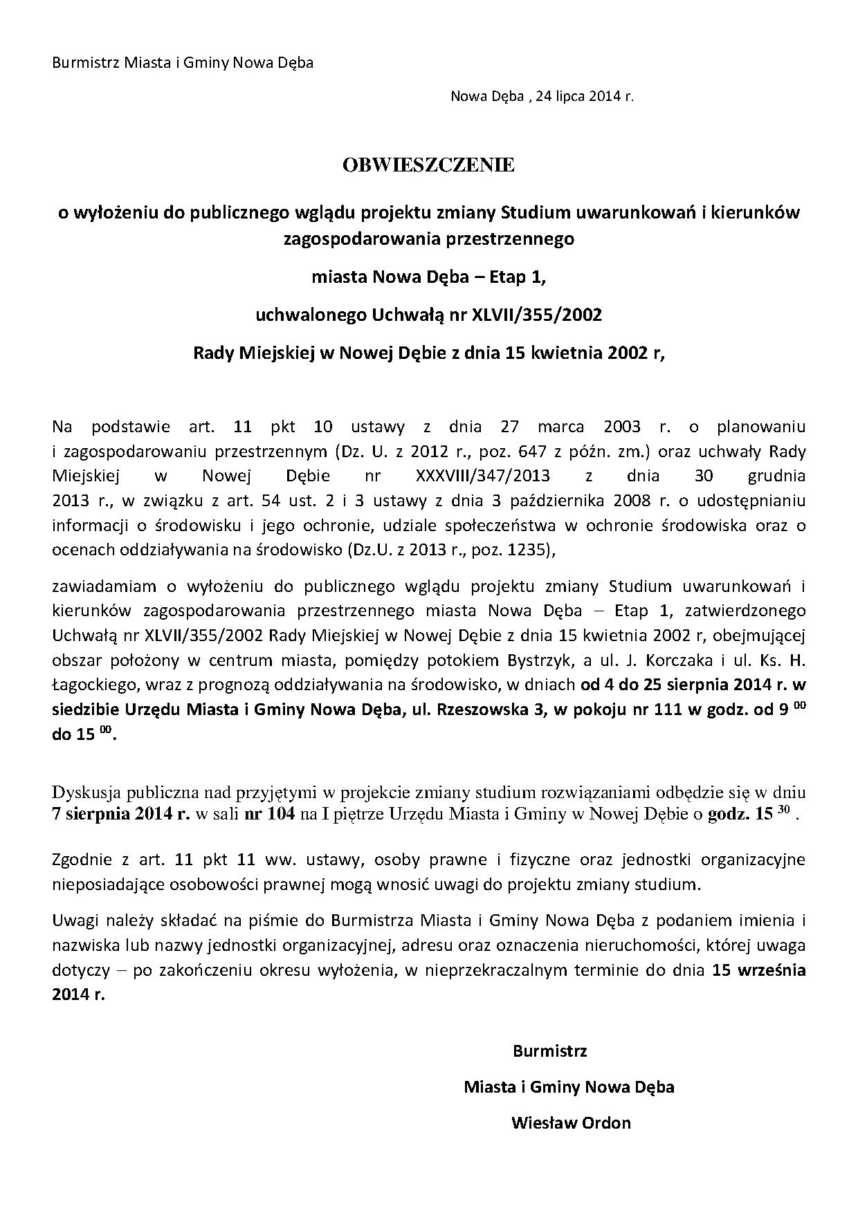 Obwieszczenie Burmistrza Miasta i Gminy Nowa Dęba z dnia 24 lipca 2014r.