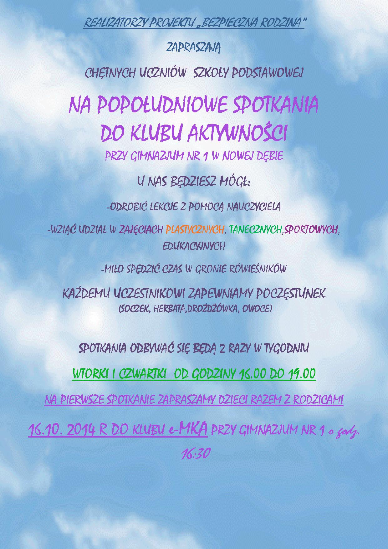 Realizatorzy projektu „BEZPIECZNA RODZINA” zapraszają uczniów szkoły podstawowej do Klubu Aktywności przy Gimnazjum nr 1