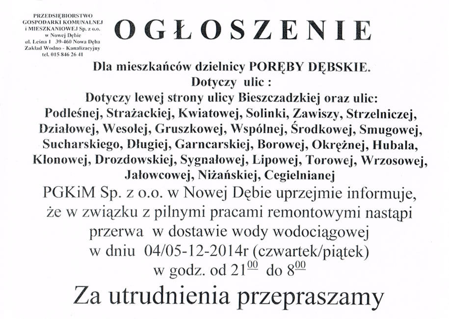 Ogłoszenie Przedsiębiorstwa Gospodarki Komunalnej i Mieszkaniowej Sp. z o.o. w Nowej Dębie - przerwa w dostawie wody