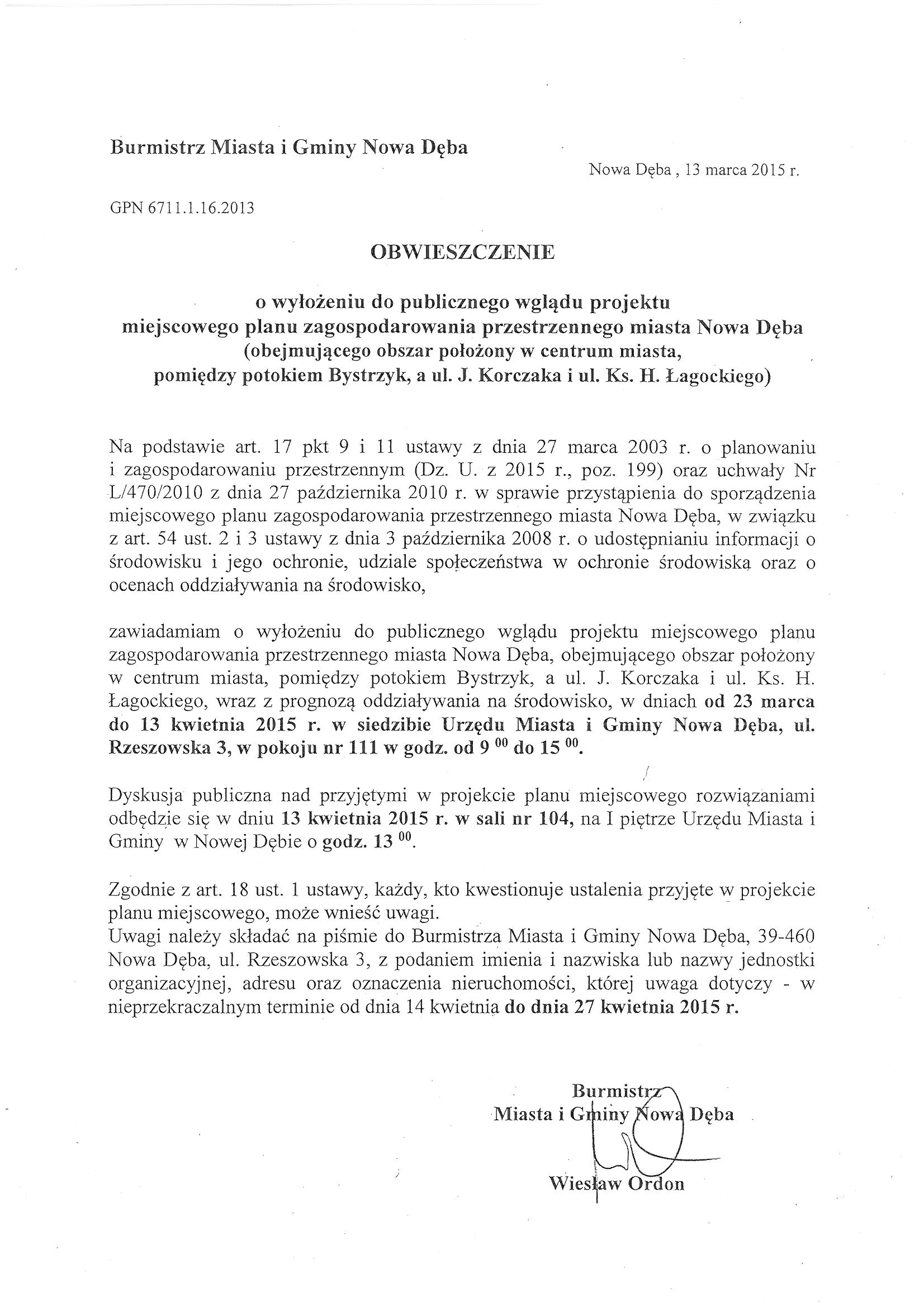 Wyłożenie do publicznego wglądu miejscowego planu zagospodarowania przestrzennego miasta Nowa Dęba