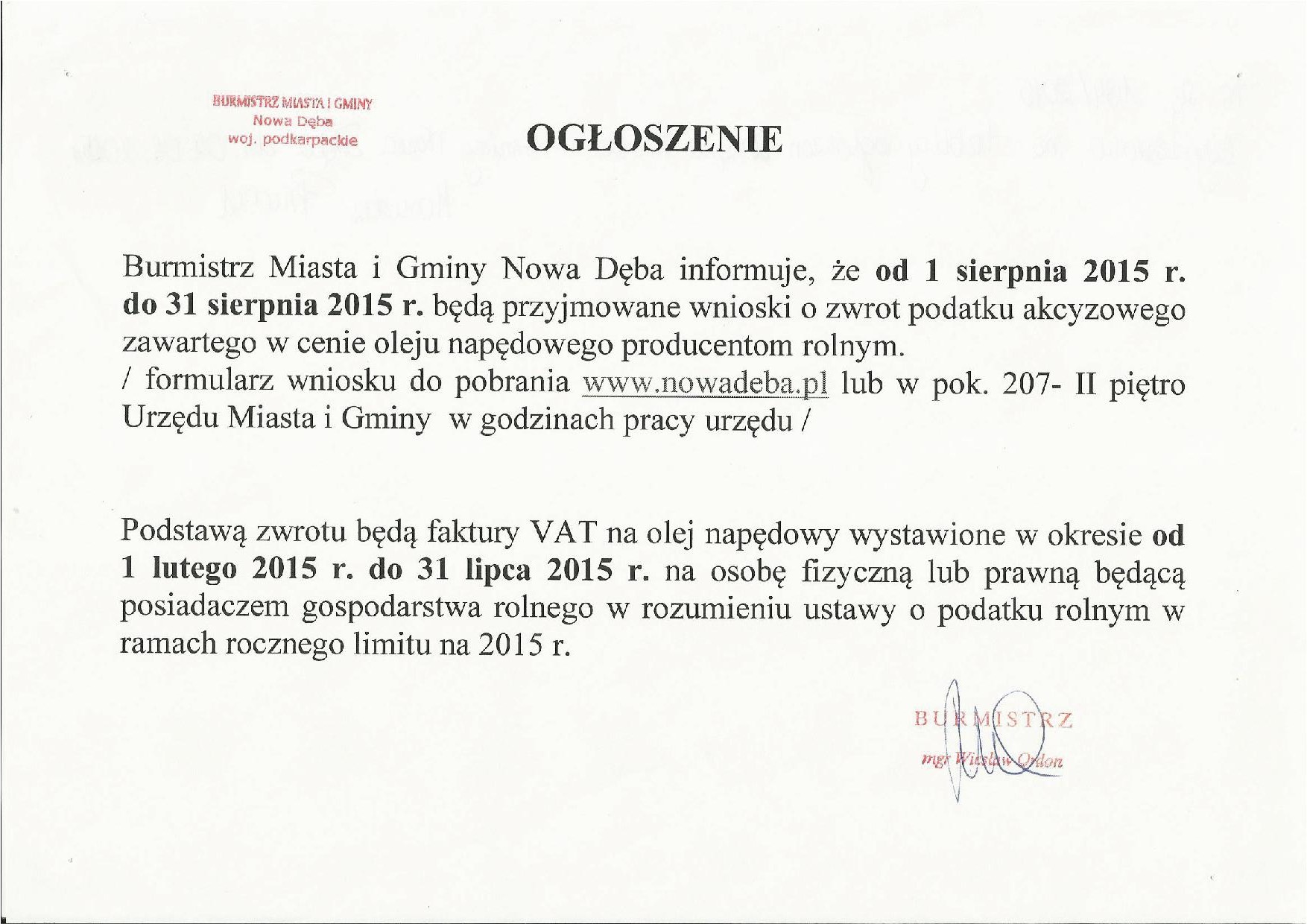Ogłoszenie Burmistrza Miasta i Gminy Nowa Dęba w sprawie zwrotu podatku akcyzowego