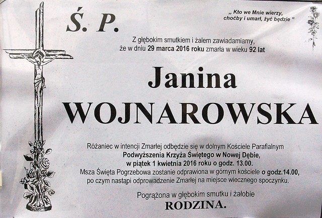 29 marca w wieku 92 lat zmarła Janina Wojnarowska - prezes Koła Światowego Związku Żołnierzy Armii Krajowej w Nowej Dębie. Msza Pogrzebowa odbędzie się w piątek 1 kwietnia 2016 r. o godz. 14:00 w kościele Podwyższenia Krzyża Świętego w Nowej Dębie.